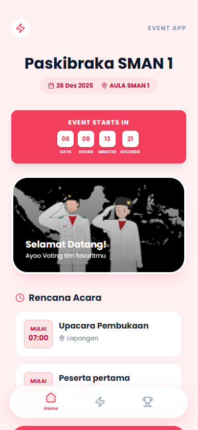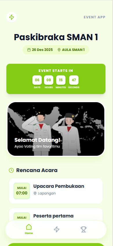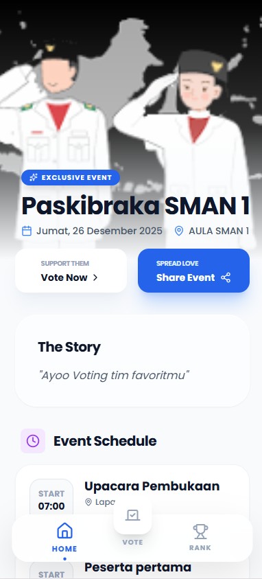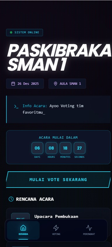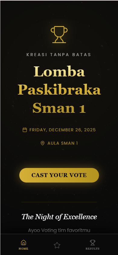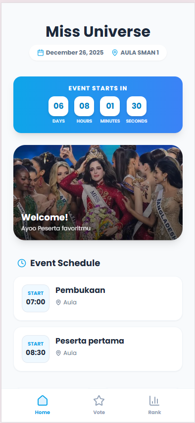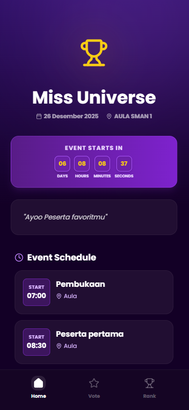 Tingkatkan keterlibatan penonton di konser, lomba, atau acara korporat Anda. Biarkan mereka menentukan siapa juaranya secara instan melalui HP masing-masing dengan tampilan yang memukau.